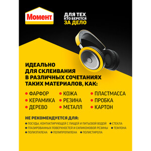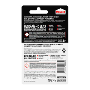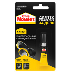 Супер Момент Универсальный отлично склеивает широкий спектр материалов. Это быстрый, надежный и стойкий секундный клей, на который всегда можно положиться! Склеивание различных видов пластмасс, резины, металлов, дерева, фарфора, керамики, кожи, пробки, тканей, картона и бумаги. Не пригоден для склеивания полипропилена, полиэтилена, политетрафторэтилена (тефлона), стекла, глазированных поверхностей и силиконовой резины. Также не пригоден для склеивания очень мягкой кожи. Никогда не применяйте клей для склеивания посуды, в которую будет наливаться горячая жидкость.