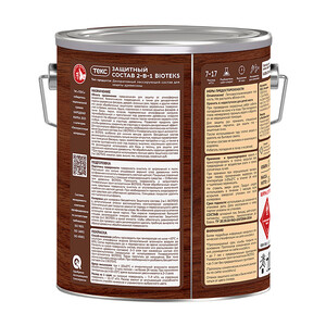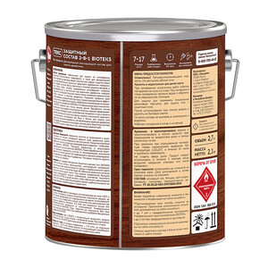 Декоративный лессирующий состав для защиты древесины. Предназначен для защиты от атмосферных воздействий, биологических повреждений, а также для декоративной отделки деревянных фасадов, дверей, оконных рам, террас (в т.ч. полов) и других новых или ранее обработанных защитными средствами деревянных строительных конструкций снаружи помещений. Не образует сплошной пленки после нанесения первого слоя, глубоко проникает в структуру древесины. Позволяет продлить срок службы древесины, сохранить ее структуру и придать декоративный эффект. Для максимально эффективной защиты необходимо комплексное использование Защитного состава 2 в 1 Bioteks и Универсального грунт-антисептика Bioteks, особенно для нижних венцов зданий. Бесцветный состав рекомендуется использовать только внутри открытых, хорошо проветриваемых помещений (беседка, гараж, хозяйственные постройки и т.д.), а также в качестве грунтовочного слоя под окраску эмалями, масляными красками. Не рекомендуется использовать для бань и теплиц, для защиты уже зараженной насекомыми древесины. Не обрабатывать мерзлую древесину. Для окраски полов террас рекомендуется использовать темные цвета Защитного состава 2 в 1 Bioteks – махагон, рябина, орех, вишня, тик, палисандр, венге, темный орех, темная рябина, красное дерево.